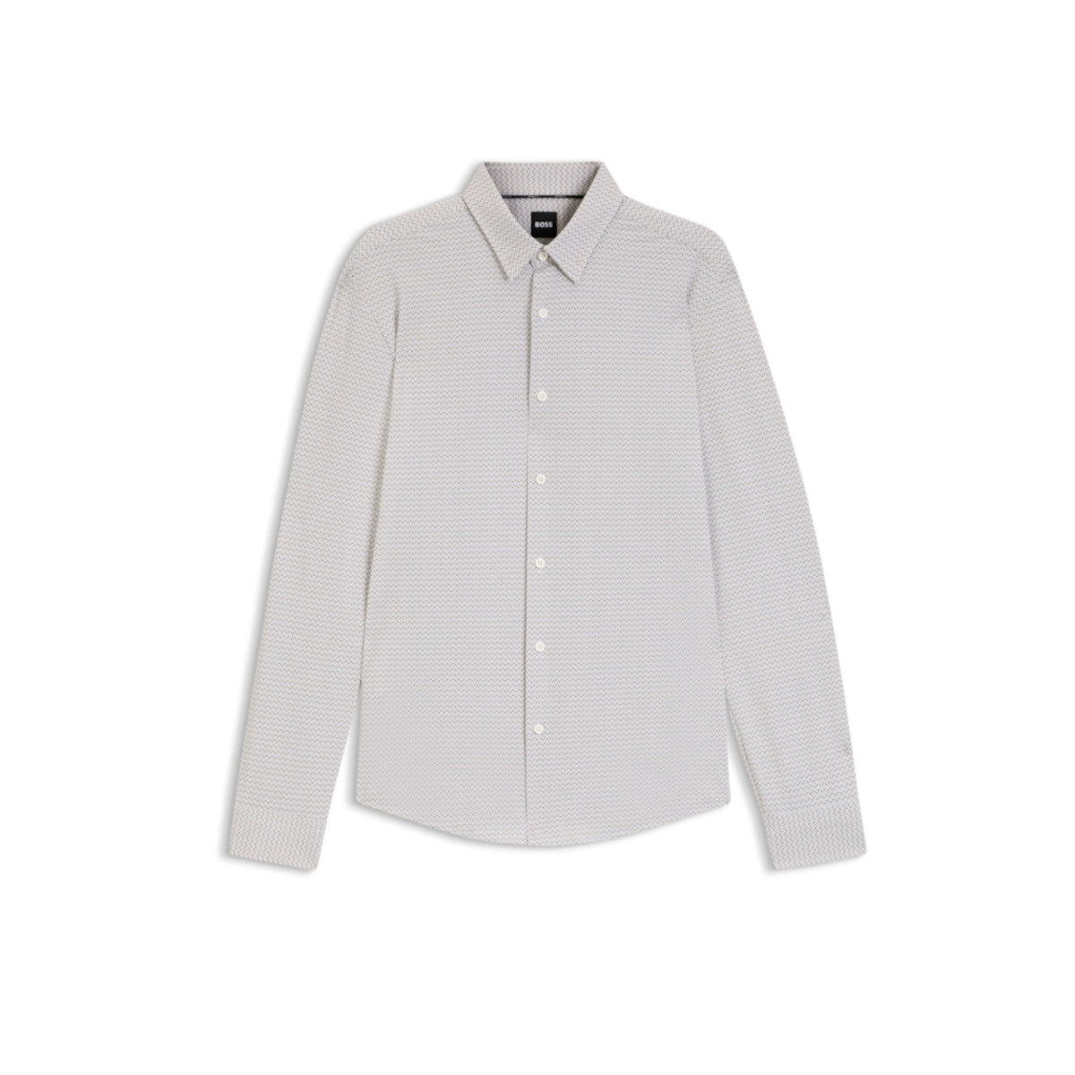 Slim Fit Shirt by BOSS Menswear, offering stretch comfort and moisture management, this shirt has a contemporary print in Italian fabric. 87% Polyamide, 13% Elastane.